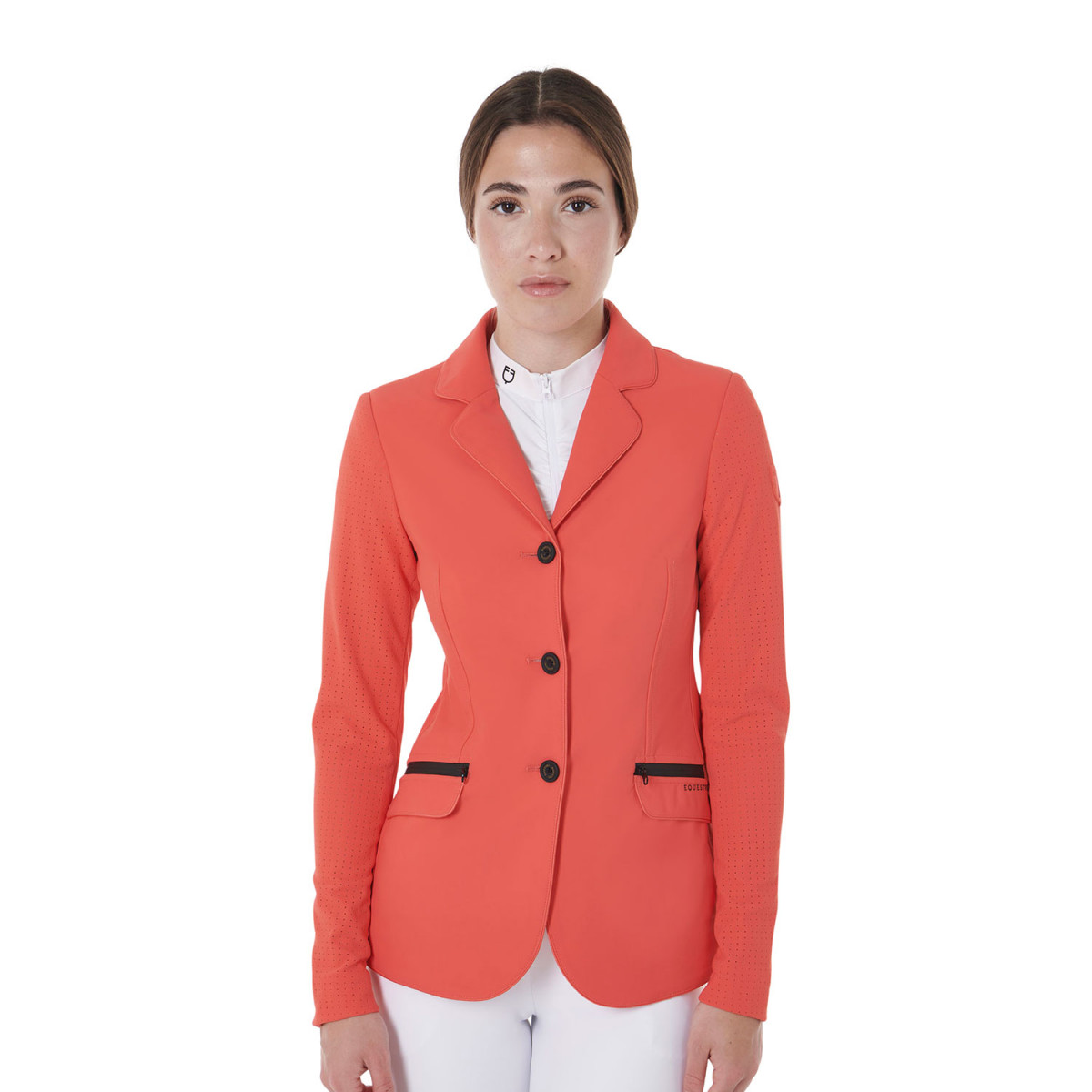 Women's competition jacket, three buttons, in breathable and ultra-light technical fabric. Zip pockets and Equestro logo embossed on the shoulder.