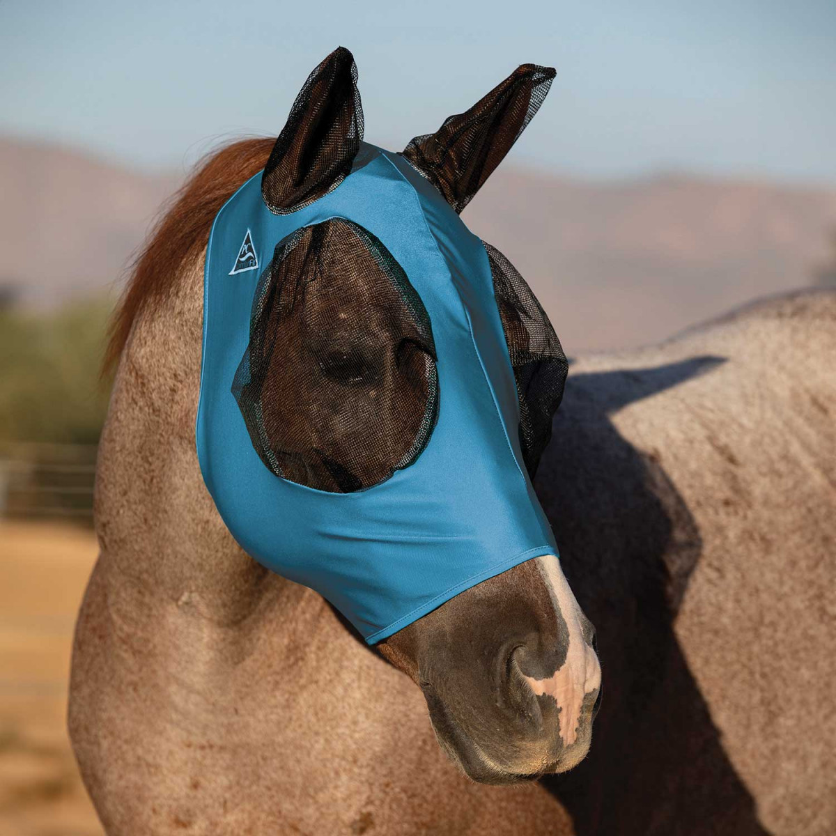 Designed with your horse's comfort in mind! Smooth, stretchy lycra fits your horse's face like a glove. Mesh around the eyes and ears allows for clear vision and keeps flies and bugs away. Details include binding around the edges and a tab at the poll for easy removal.