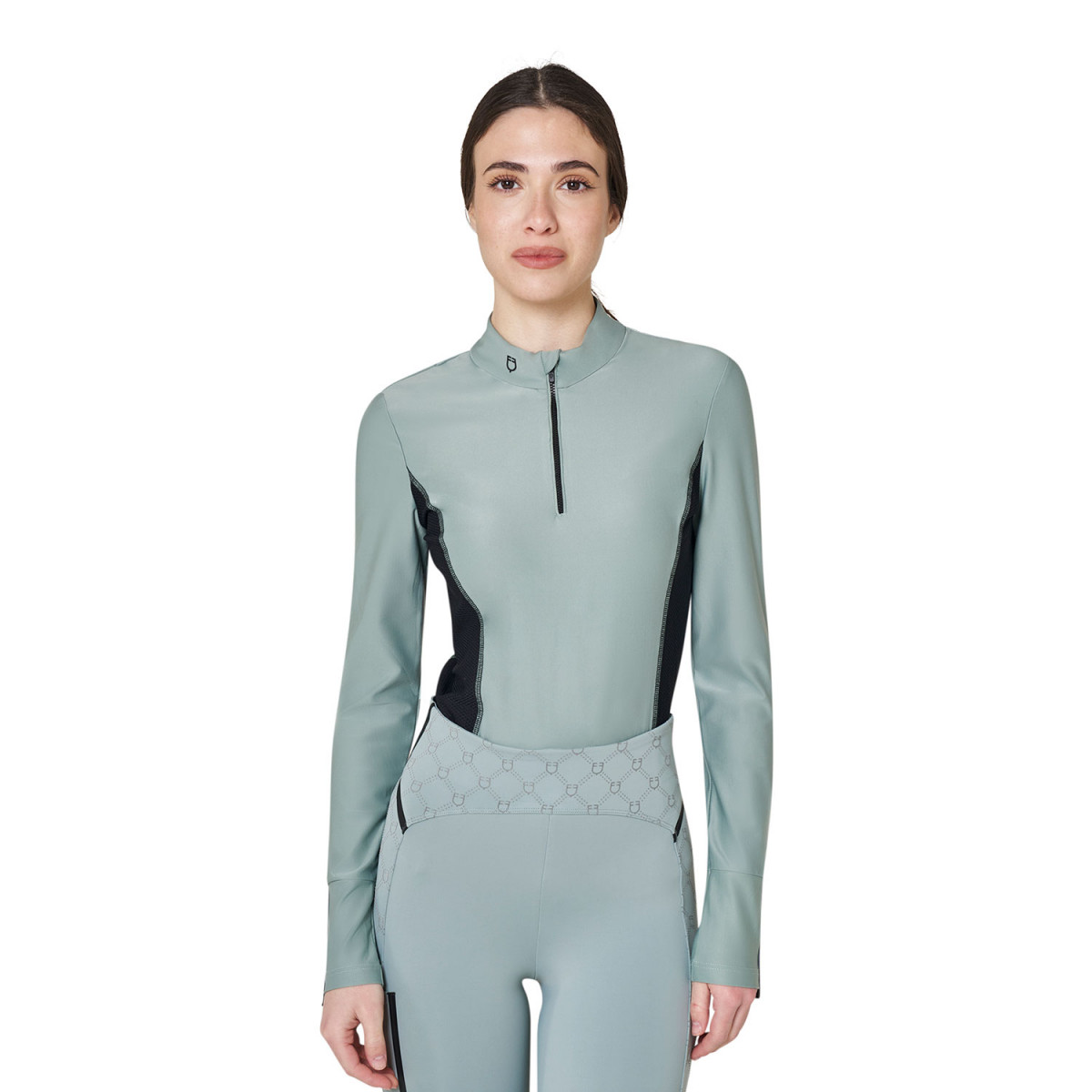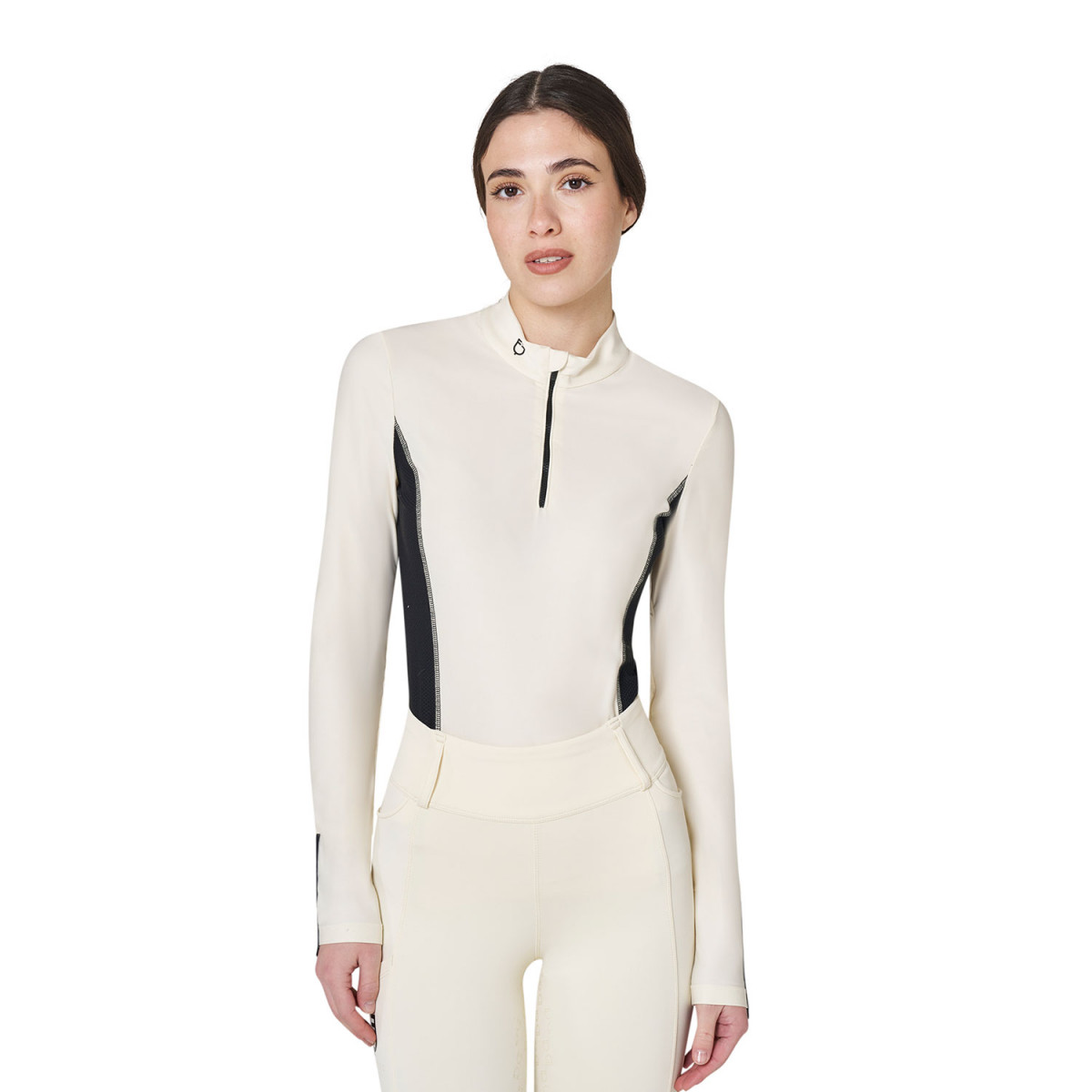 Balanced between style and performance, the garment is designed to adhere perfectly to the body with a slim, feminine and ergonomic fit.