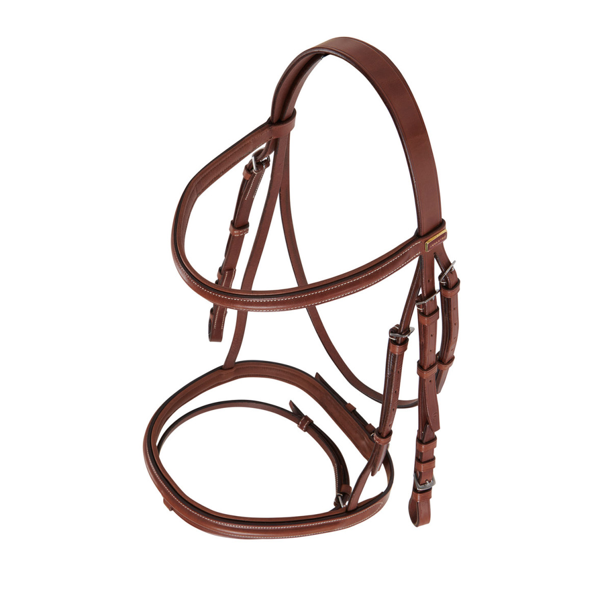 English bridle in high quality soft leather, with stainless steel buckles and rubber reins that give safety, stability and resistance over time. Padded browband and noseband decorated with contrasting embroidery, for a unique style. The browband and chin straps are both adjustable for a perfect fit and maximum comfort.