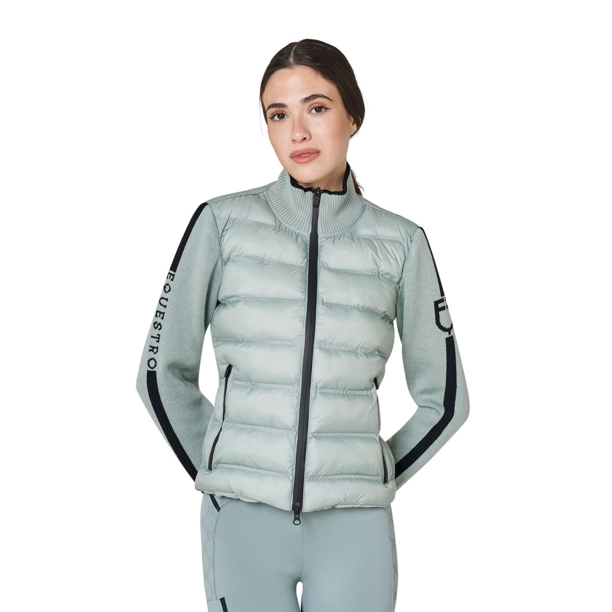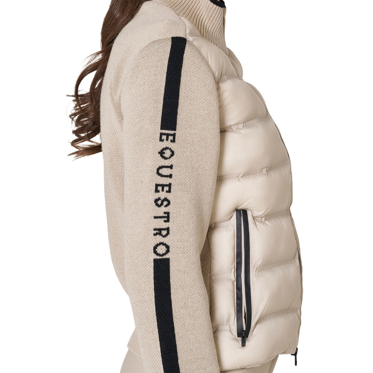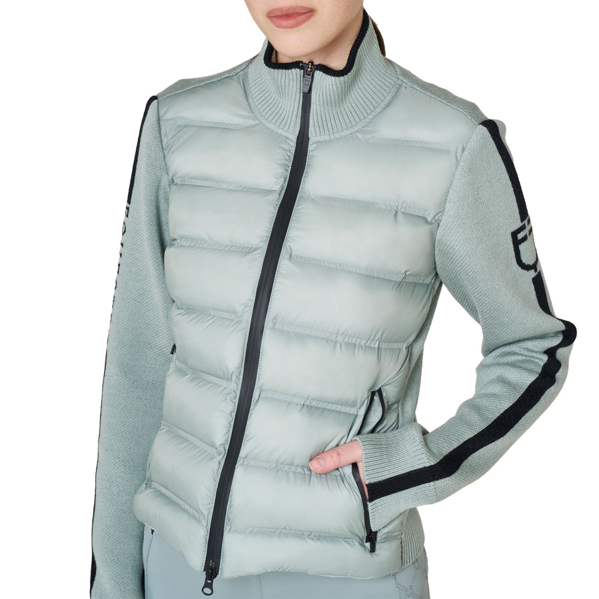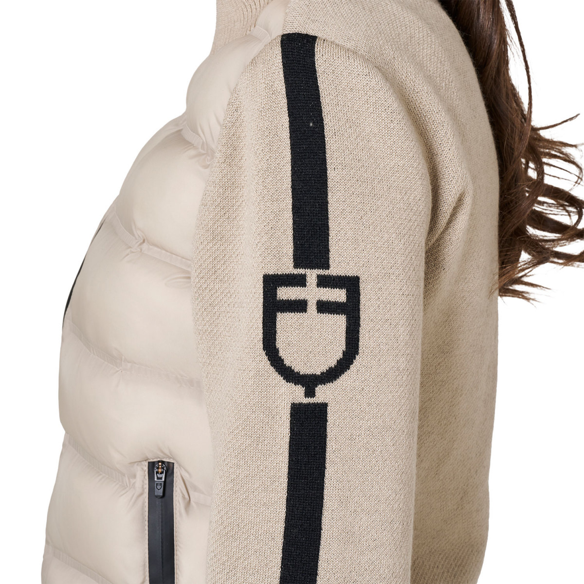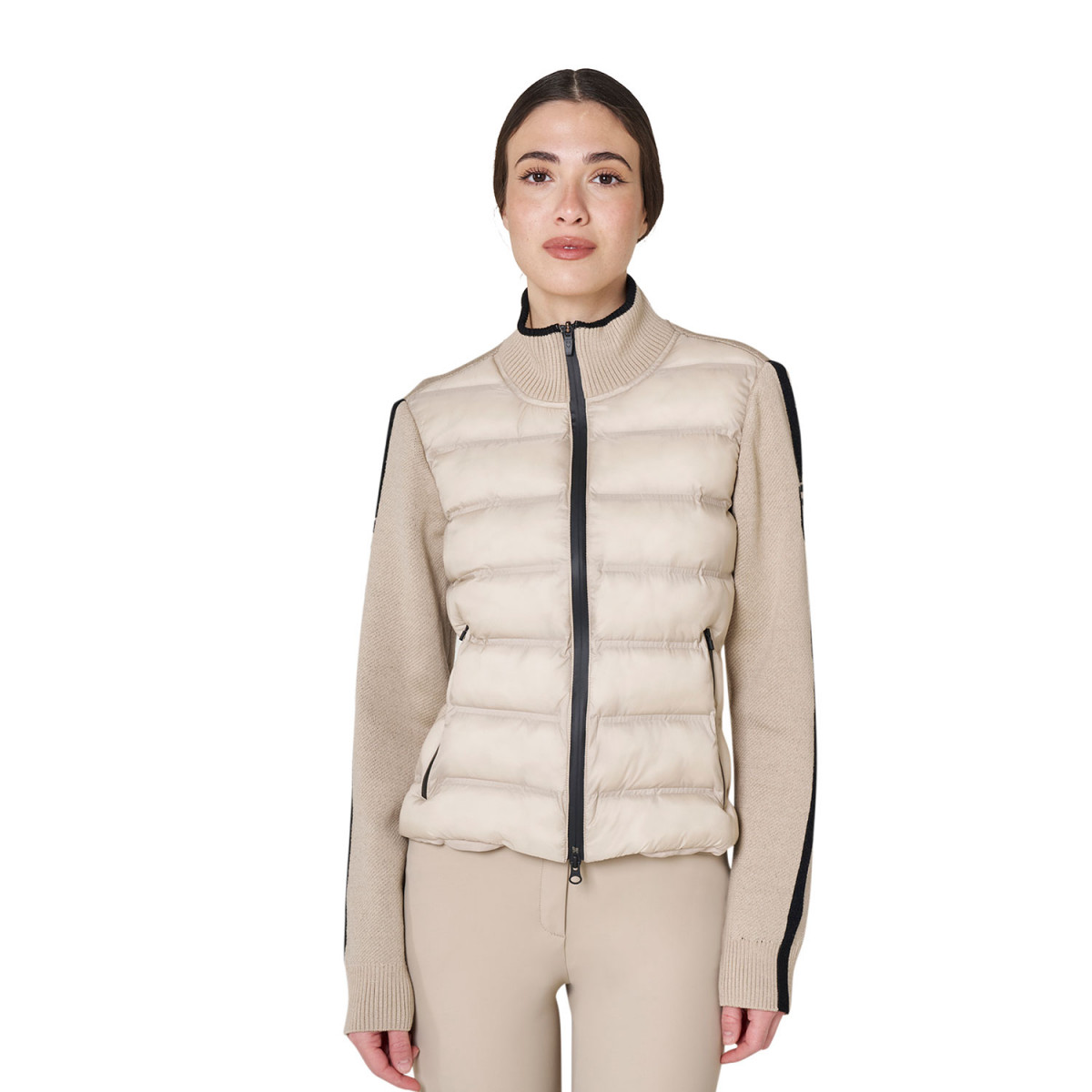 Giacca piumino realizzata in tessuto tecnico e maniche in lana. Il design della giacca è una fusione di semplicità e raffinatezza, con dettagli attentamente curati che la rendono unica.