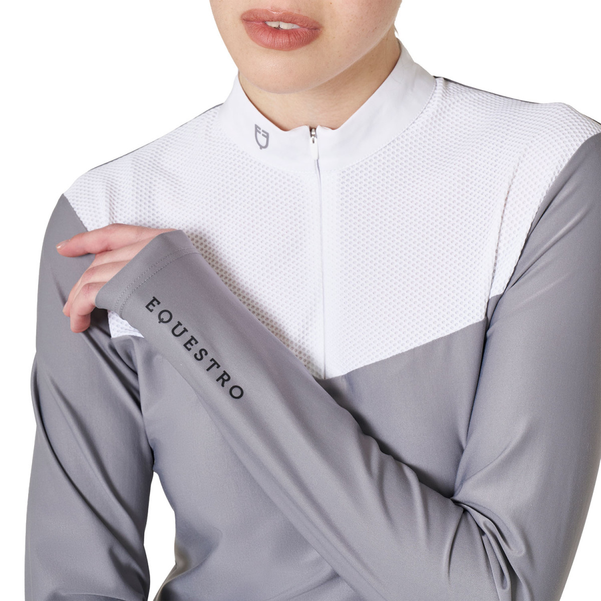 Polo da donna slim fit in tessuto tecnico e tessuto mesh sul petto, con comoda chiusura con zip a scomparsa nella zona frontale.