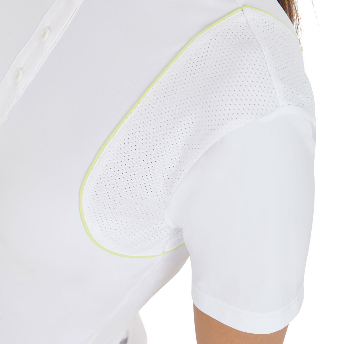 Polo donna slim fit a mezza manica in tessuto tecnico e mesh, che garantiscono l'evaporazione e la dispersione del sudore.