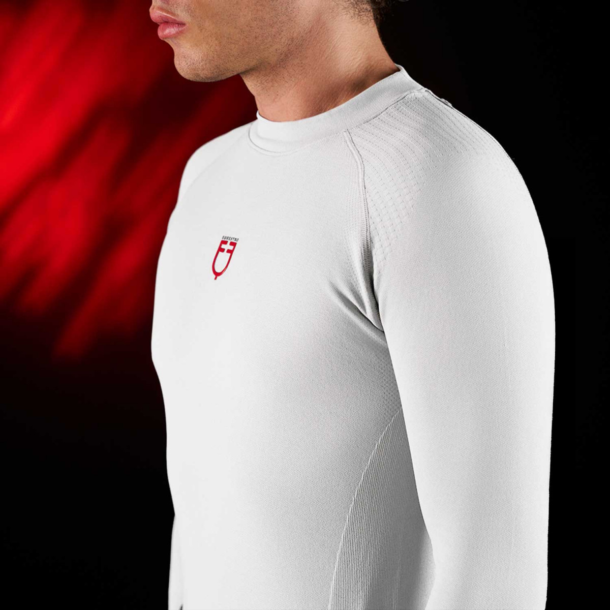 L'estetica innovativa e funzionale si trova nell'attenzione ai dettagli: gli inserti in tessuto a costine e a nido d'ape nelle zone soggette a maggiore sudorazione insieme alle applicazioni del logo Ridertech in rosso acceso, aggiungono un tocco di stile e efficienza al capo.