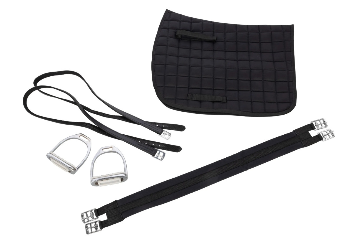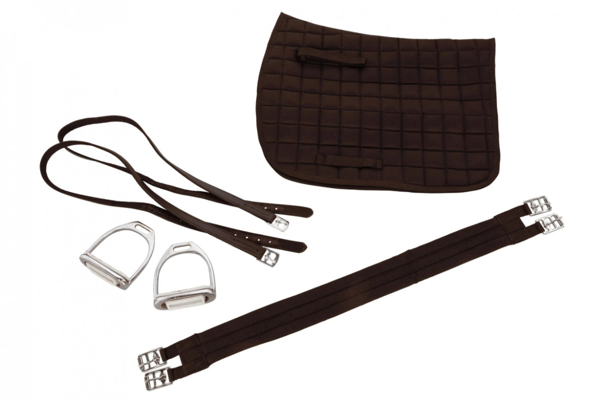Kit completo composto da: 1 sella, 1 coperta per sella, 2 staffe, 2 cinghie per staffe, 1 sottopancia