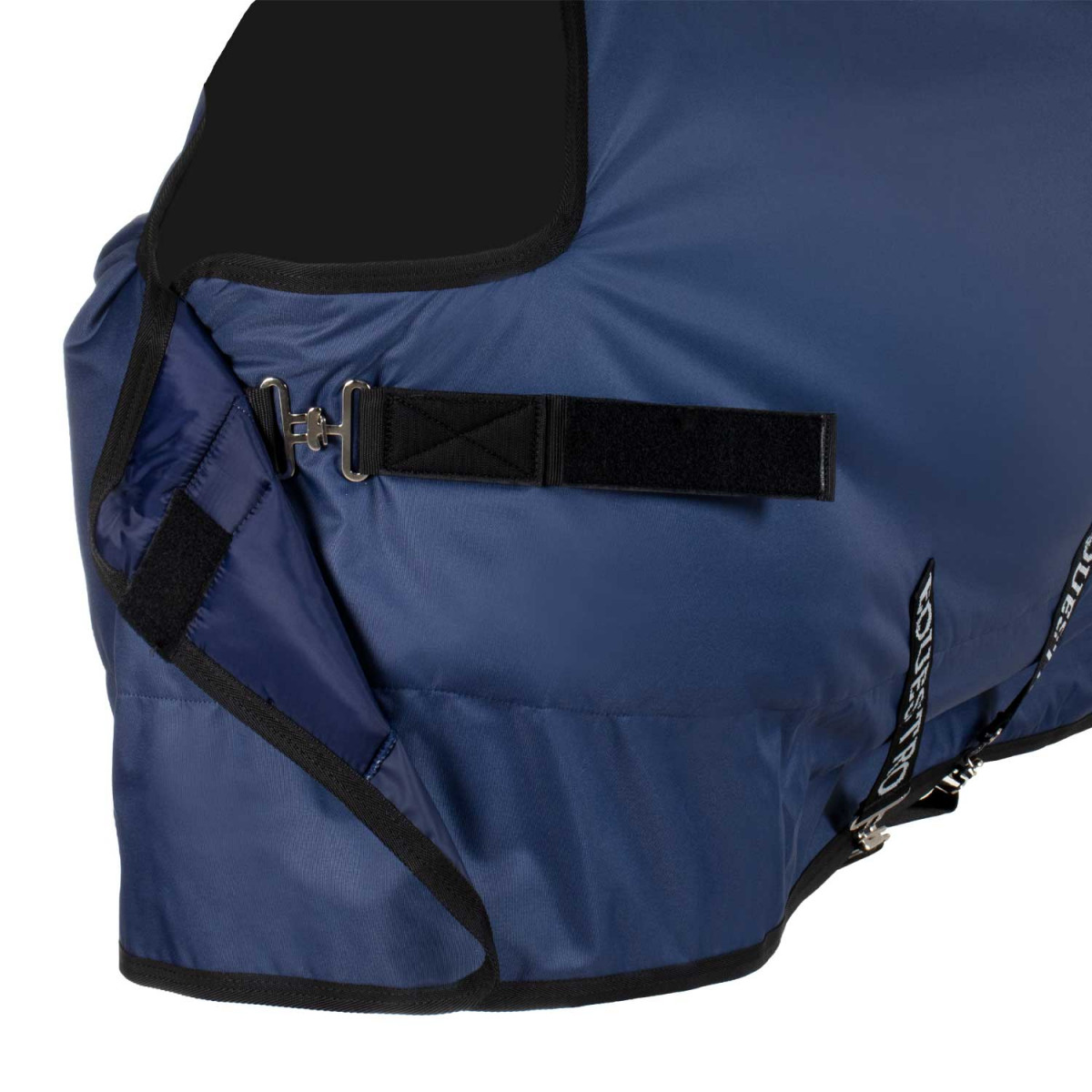 La coperta è dotata di cinghie incrociate e regolabili a seconda delle esigenze, cinturini elastici per le gambe, ampia e confortevole protezione per la coda e chiusura in poliestere con fibbie cromate a sgancio rapido.