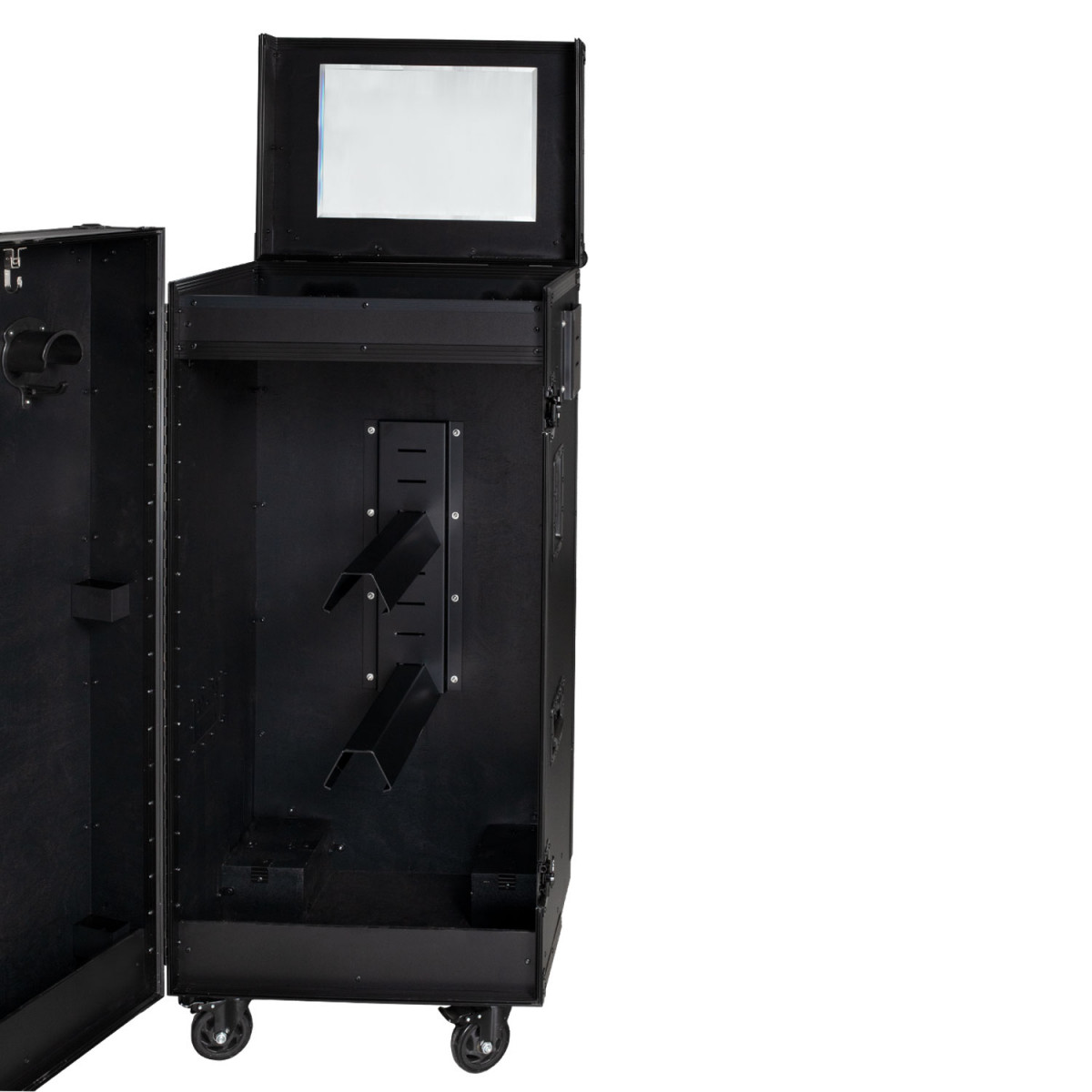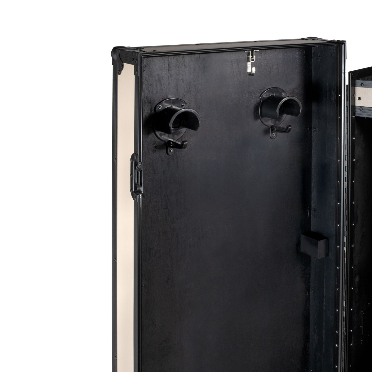Rinforzato da profili angolari in metallo nero e chiusure a farfalla.