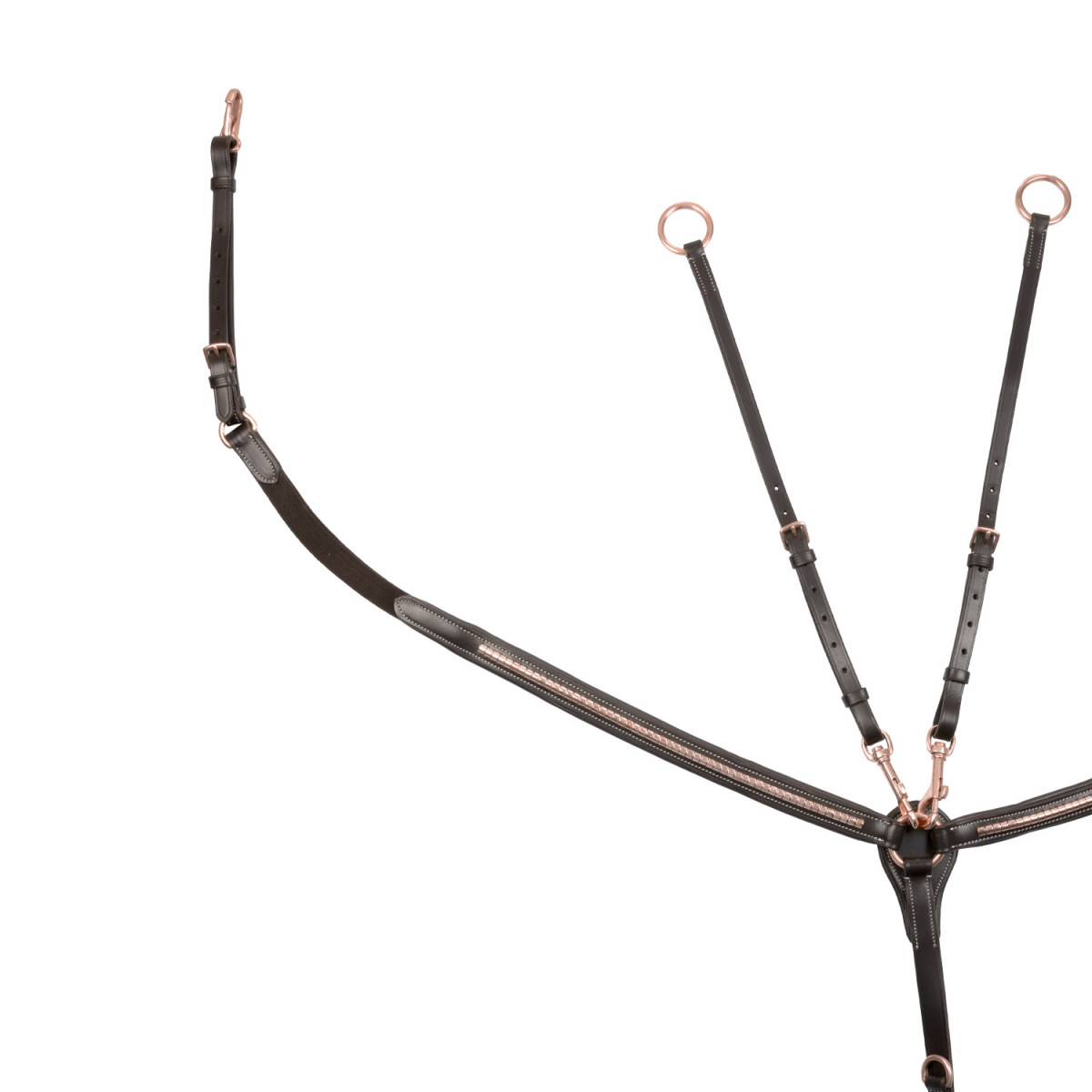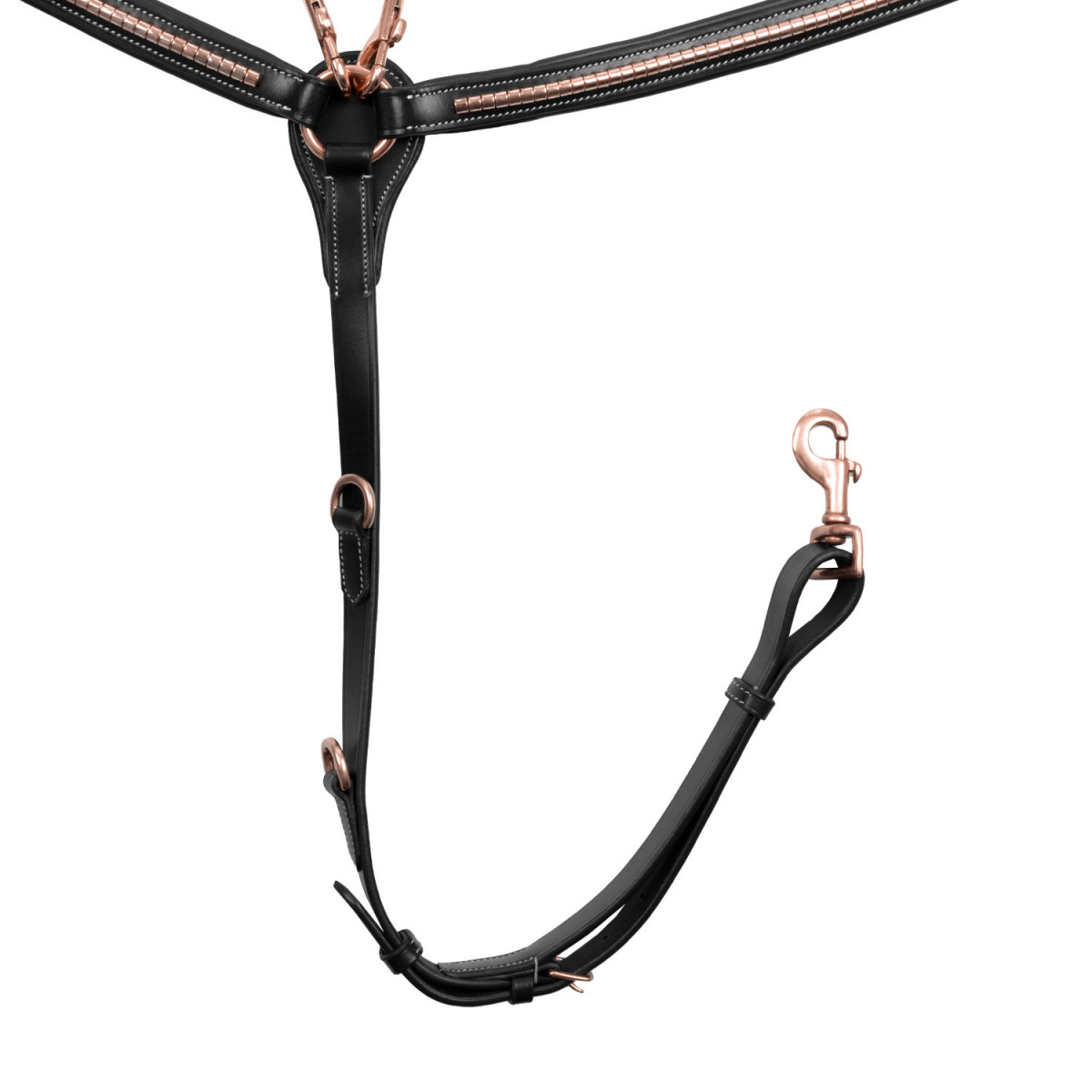 Il Pettorale in pelle conciata impedisce alla sella di indietreggiare, per mezzo di ganci in acciaio inox color rose gold che vanno a legarsi direttamente alle cambre della sella, ai riscontri e al sottopancia.