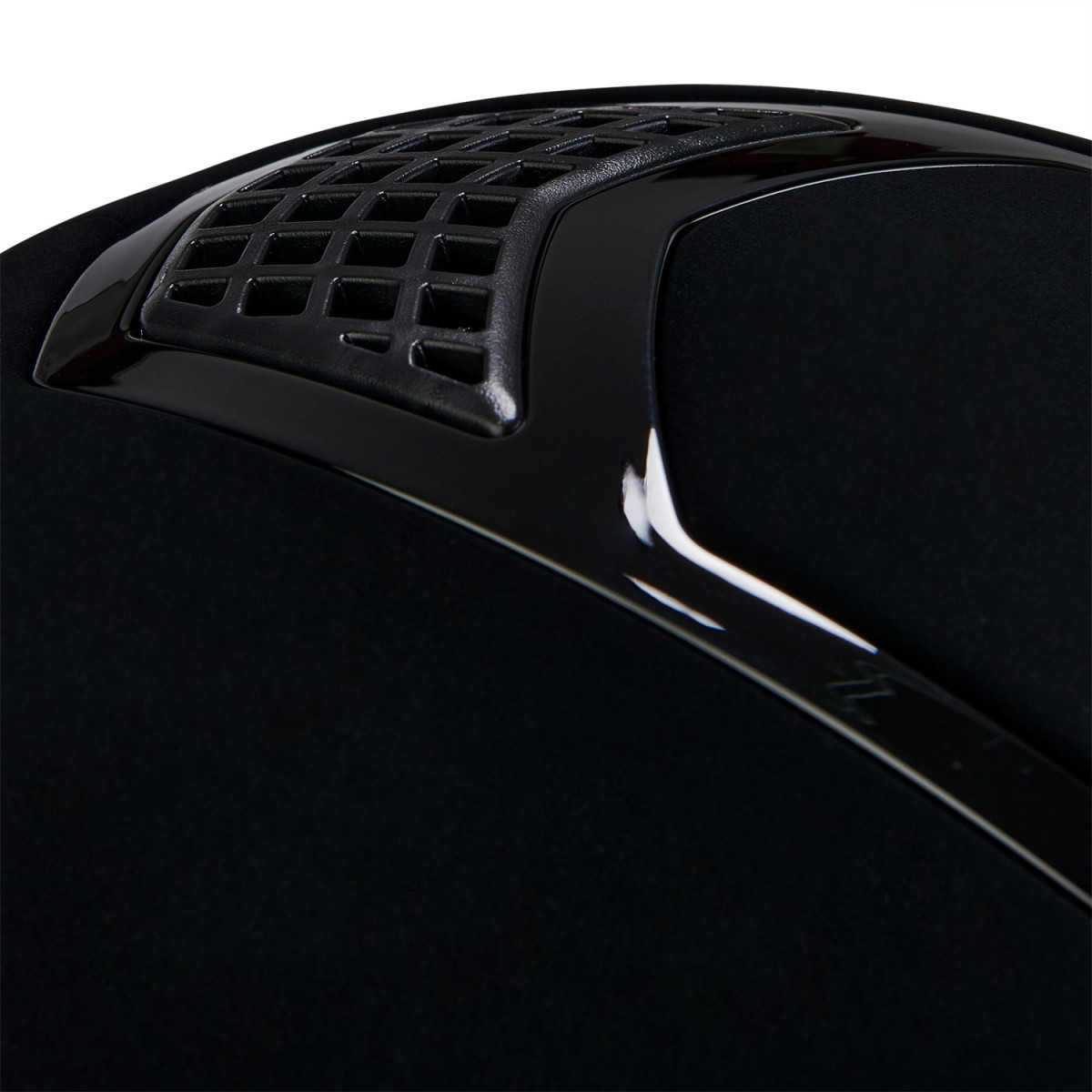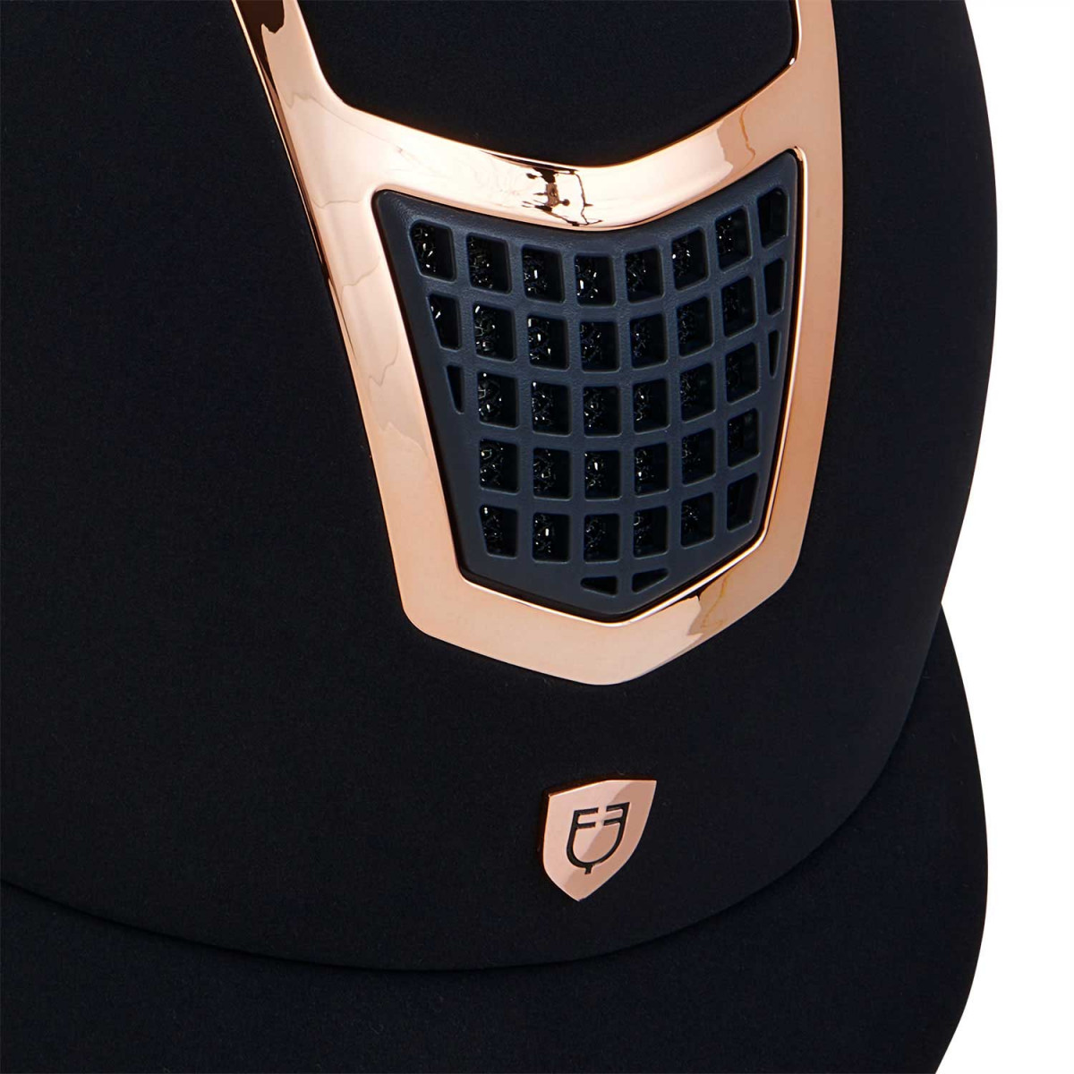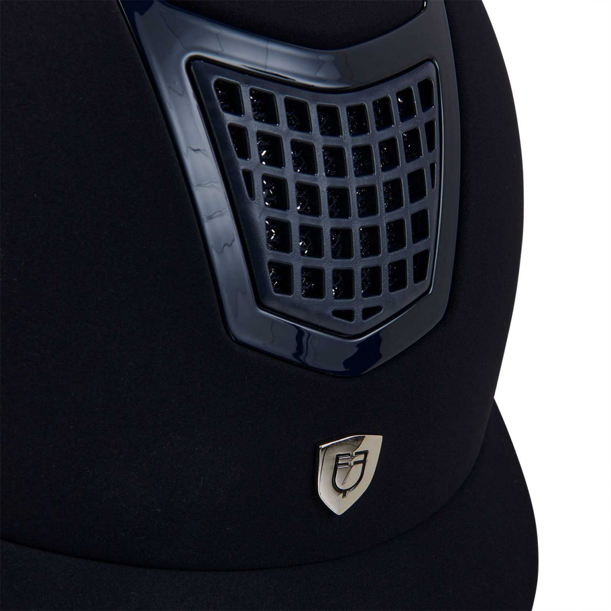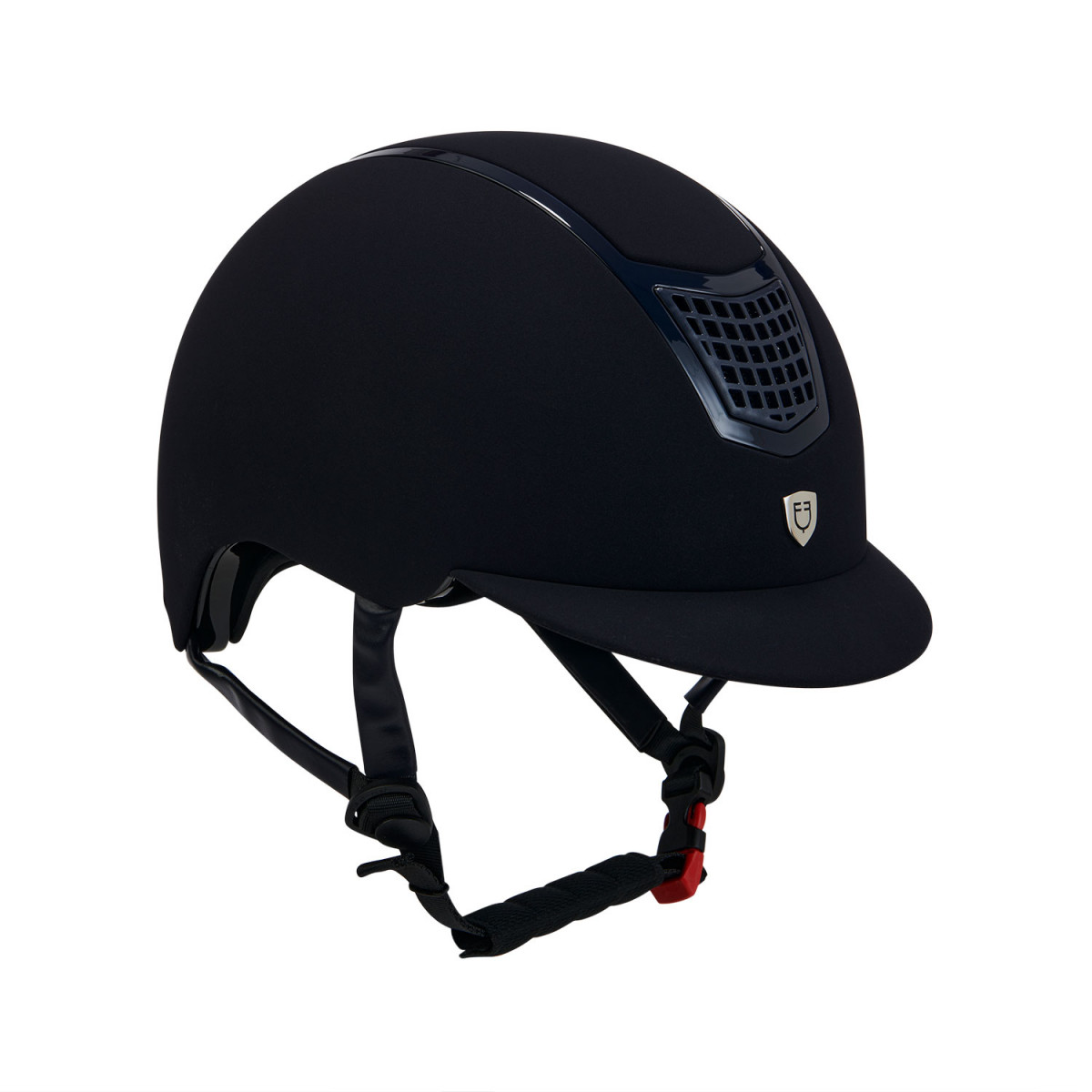 La calotta esterna è in velluto con prese d’aria frontali decorate da profili di vario colore e targhetta con logo Equestro.