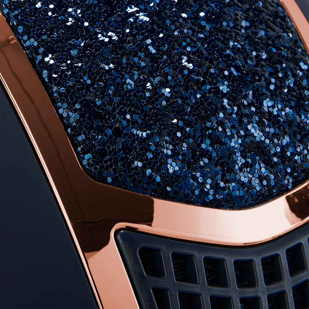La calotta esterna è opaca, impreziosita dall'applicazione di brillantini, tono su tono, e da targhetta con logo Equestro