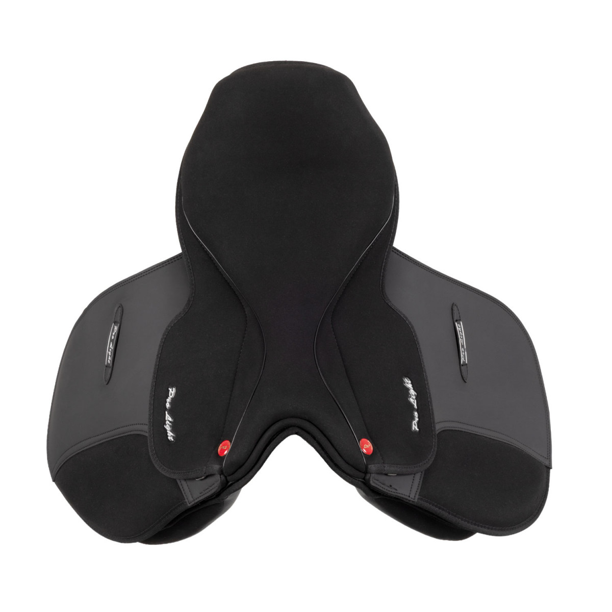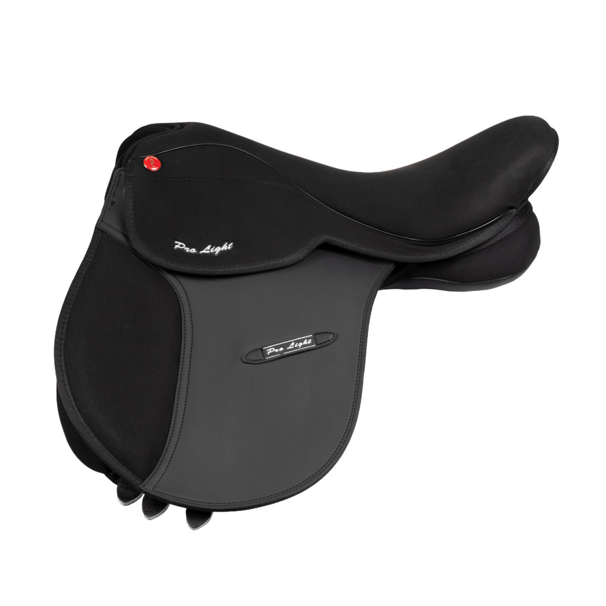 Sella da salto in PU leather scamosciato, appoggi regolabili e arcione in nylon.