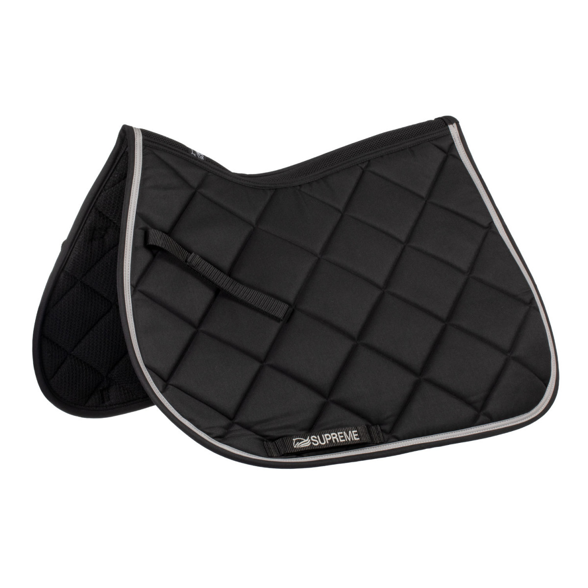 Sottosella trapuntato realizzato in poliestere. Limbottitura interna ha uno spessore di 15 mm che consente di alleggerire il peso della sella sulla schiena del cavallo, disperdendone la pressione. Le reti daria sul dorso consentono un'elevata traspirabilità. Gli agganci per il sottopancia sono in velcro, apribili e decorati con scritta Supreme. Il sottosella è rifinito con bordatura a contrasto.